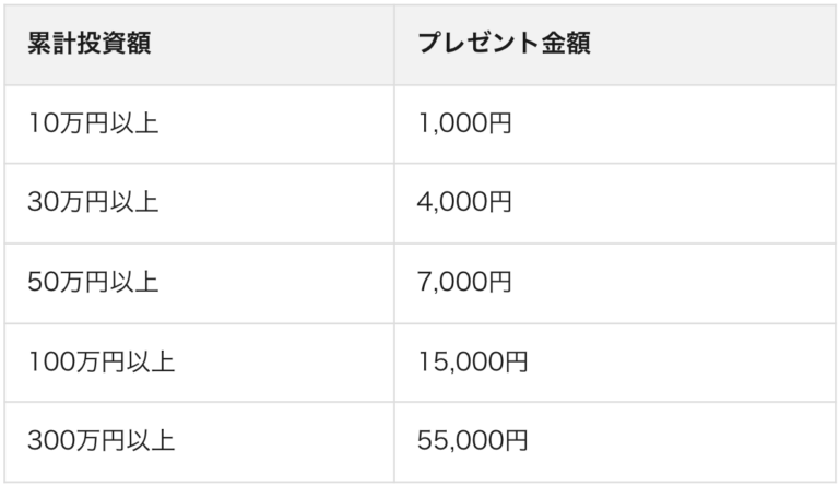 また、キャンペーン期間中の累計投資額に応じて最大55,000円の現金がもらえます。
