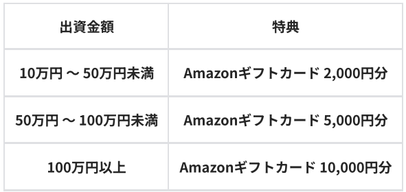 | キャンペーン内容 | 新規口座開設と10万円以上のファンド投資で投資額に応じて最大10,000円分のAmazonギフト券をプレゼント。![]() |