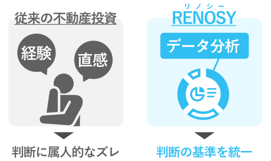 リノシーは、人間の感覚や経験ではなく、独自のデータベースをもとに物件の収益性や将来性を見極めています。