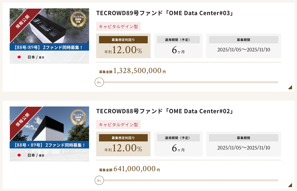 また、TECROWDでは、利回り12%・運用期間6ヶ月の新ファンドの募集2件同時に予定されています。
