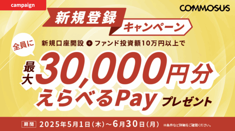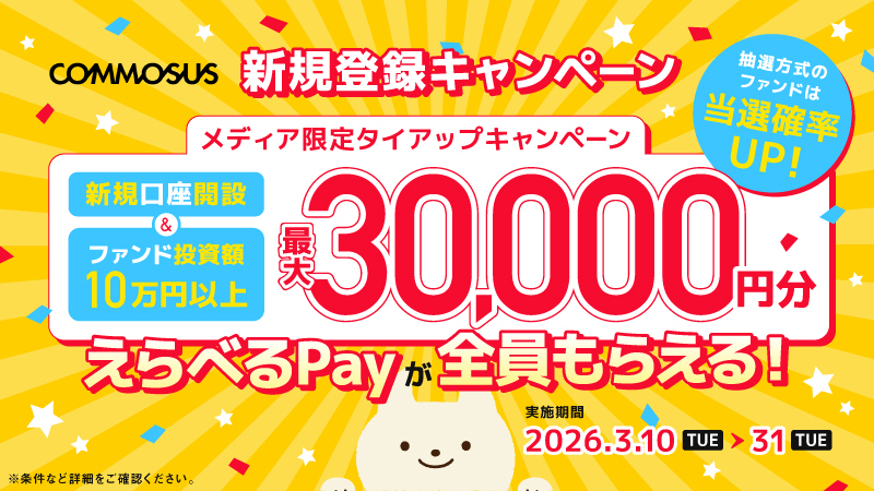 | キャンペーン内容 | 新規口座開設と10万円以上のファンド投資で、投資額に応じて最大30,000円分の「えらべるPay」をプレゼント。![]() ![]() 抽選方式ファンドへの応募は、当選確率が上がる。 |