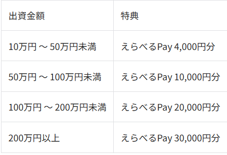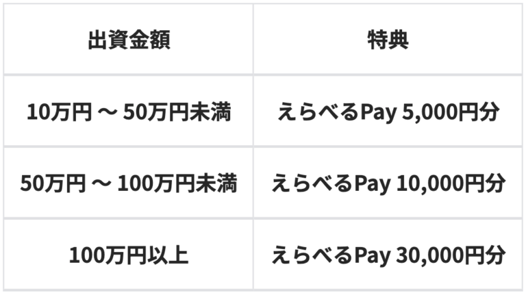 | キャンペーン内容 | 新規口座開設と10万円以上のファンド投資で、投資額に応じて最大30,000円分の「えらべるPay」をプレゼント。![]() 抽選方式ファンドへの応募は、当選確率が上がる。 |