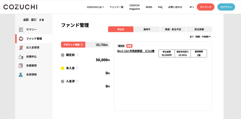 この出資が確定した場合、入金指示の連絡がきて、無事入金を済ませばCOZUCHIが運用をしてくれます。
