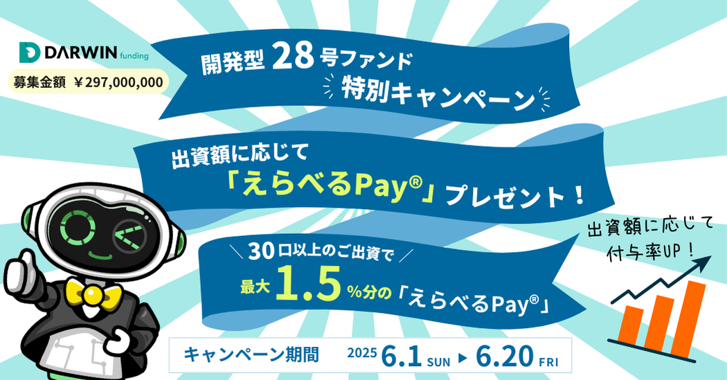 ダーウィンファンディングで投資したことのない方が、開発型24号ファンドへ10万円以上出資することで、2,000円分のAmazonギフト券がもらえます。