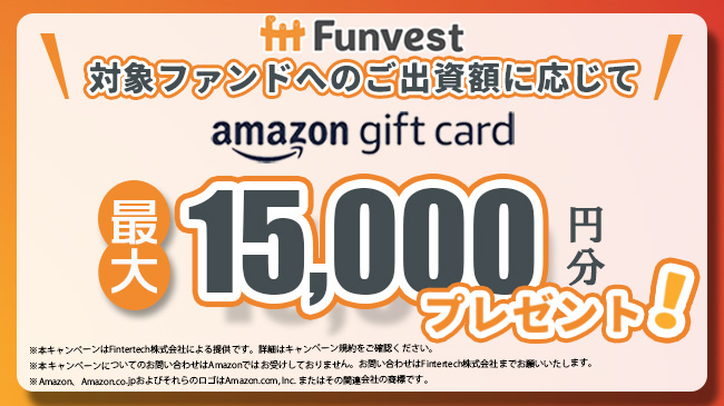 現在、Funvestでは新規会員登録で1,000円分のAmazonギフト券もらえるキャンペーンと、初出資で1,500円分のAmazonギフト券がもらえるキャンペーンを実施しています。(2025年11月時点)