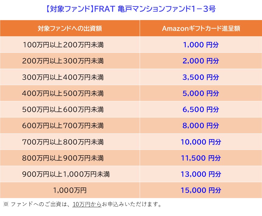 「FRAT 亀戸マンションファンド1-3号」への出資額に応じて最大15,000円分のAmazonギフトカードがプレゼントされます。