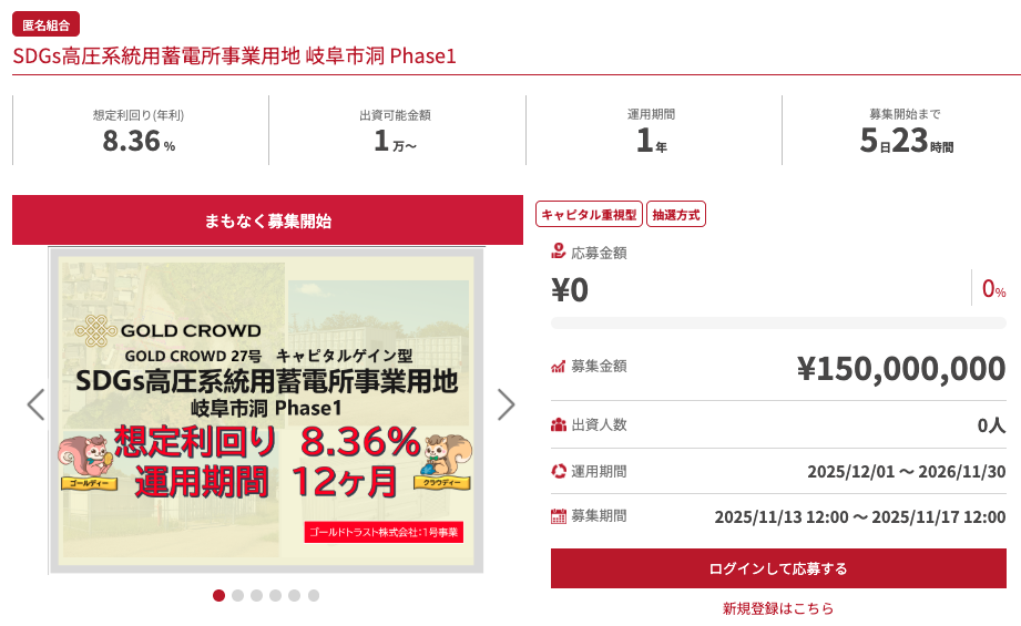 また、ゴールドクラウドでは利回り8.36%のファンドが募集予定です!