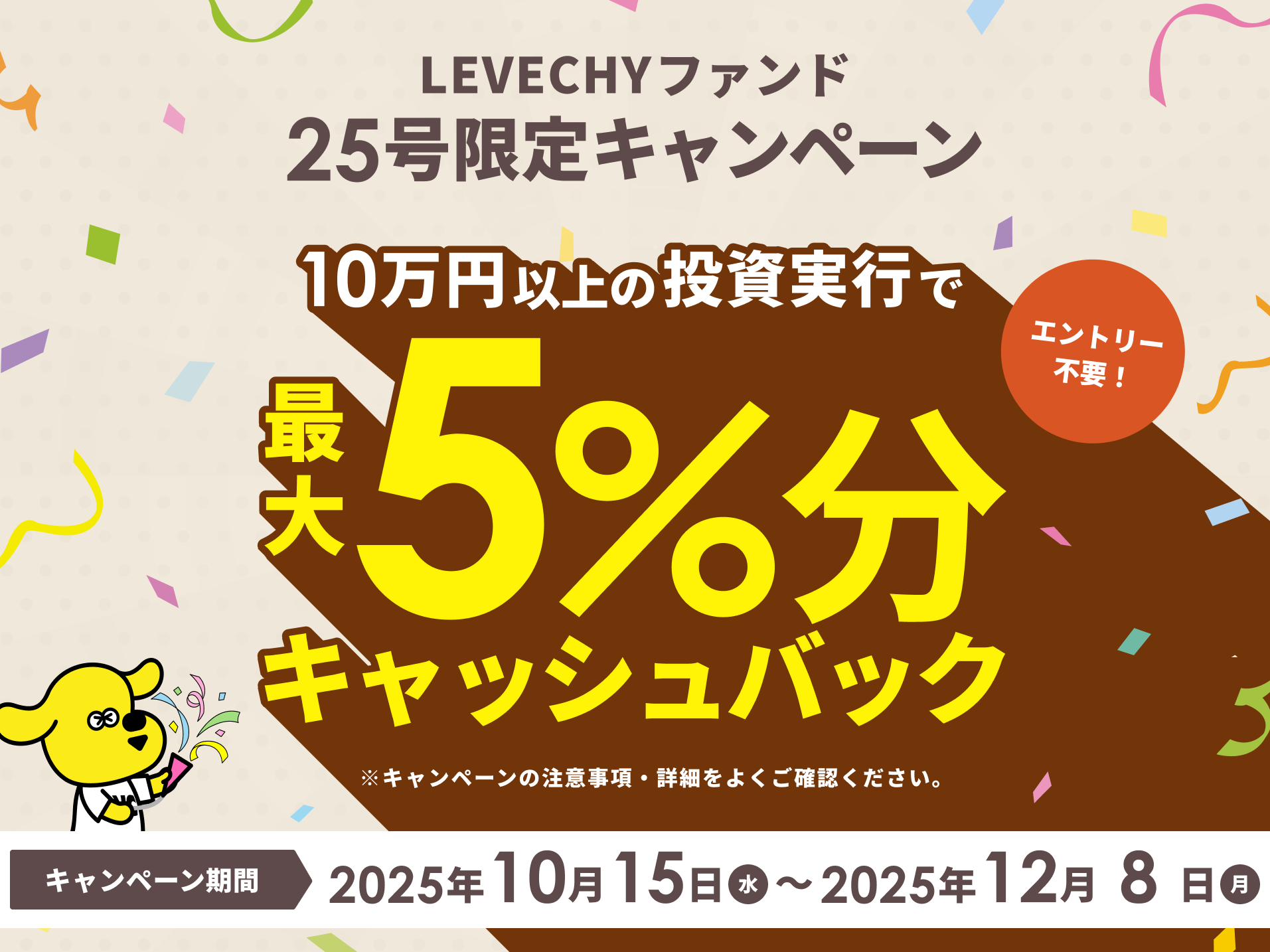 さらに、レベチーではLEVECHY25号ファンドへの出資で最大5%がキャッシュバックされるキャンペーンを実施しています。