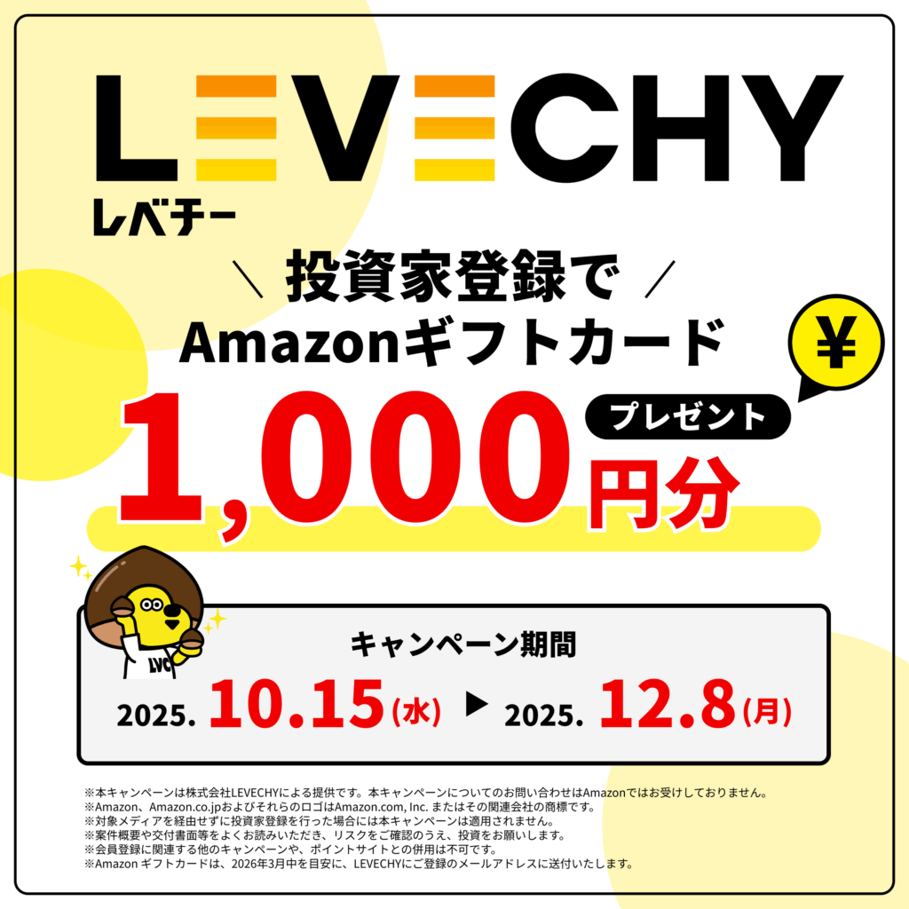 また、レベチーでは、当サイト限定で、新規投資家登録でAmazonギフト券1,000円分のプレゼントキャンペーンを実施中です!