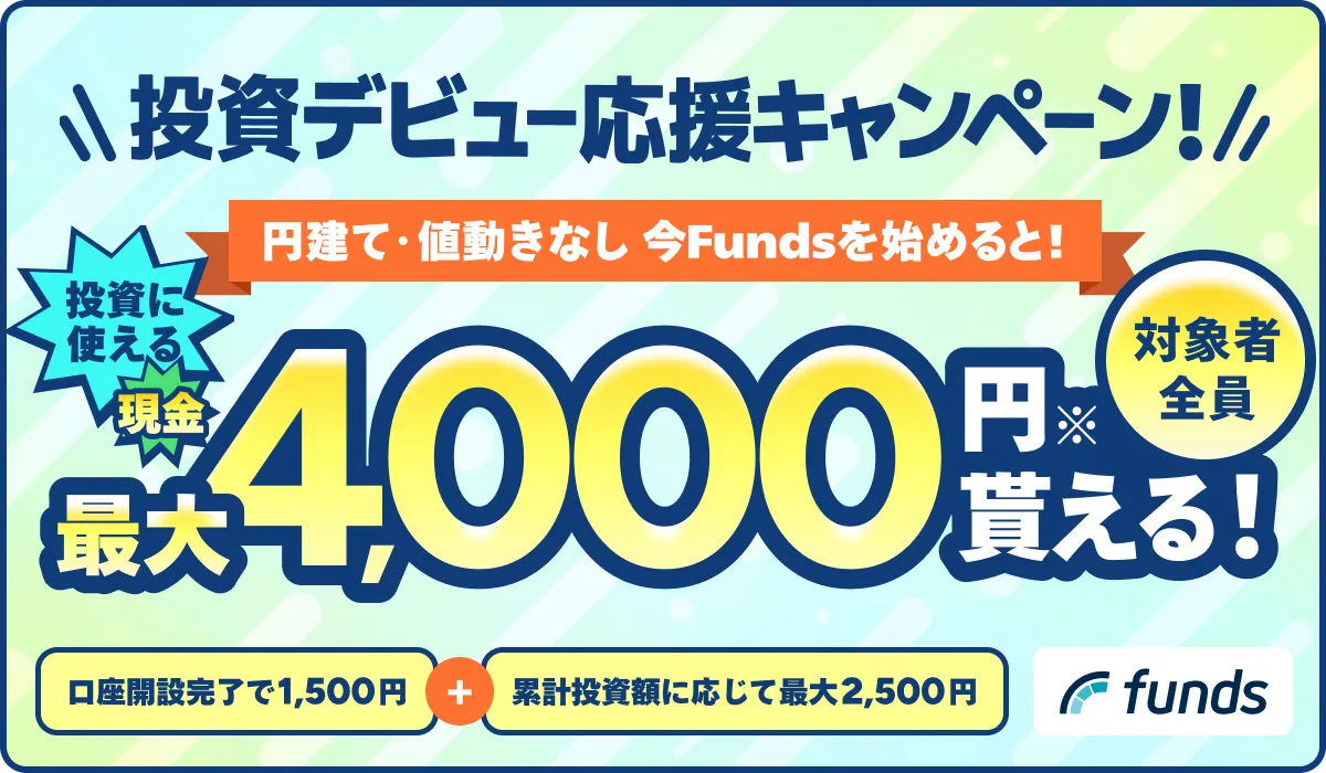 | キャンペーン申し込み時の注意点 | ・口座開設が完了できなかった場合は対象外 ・すでにFundsで口座開設を完了している場合は対象外 |