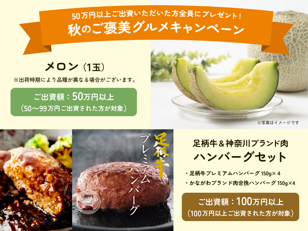50万円以上でメロン1玉、100万円以上で足柄牛ハンバーグセットがプレゼントされます。