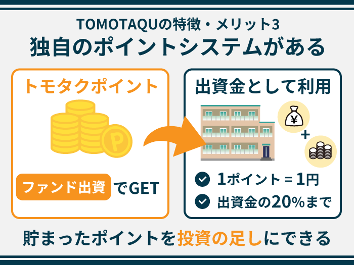 トモタクポイントは新規会員登録やファンドの出資などのタイミングで付与され、貯まったポイントは出資金として利用することが可能です。