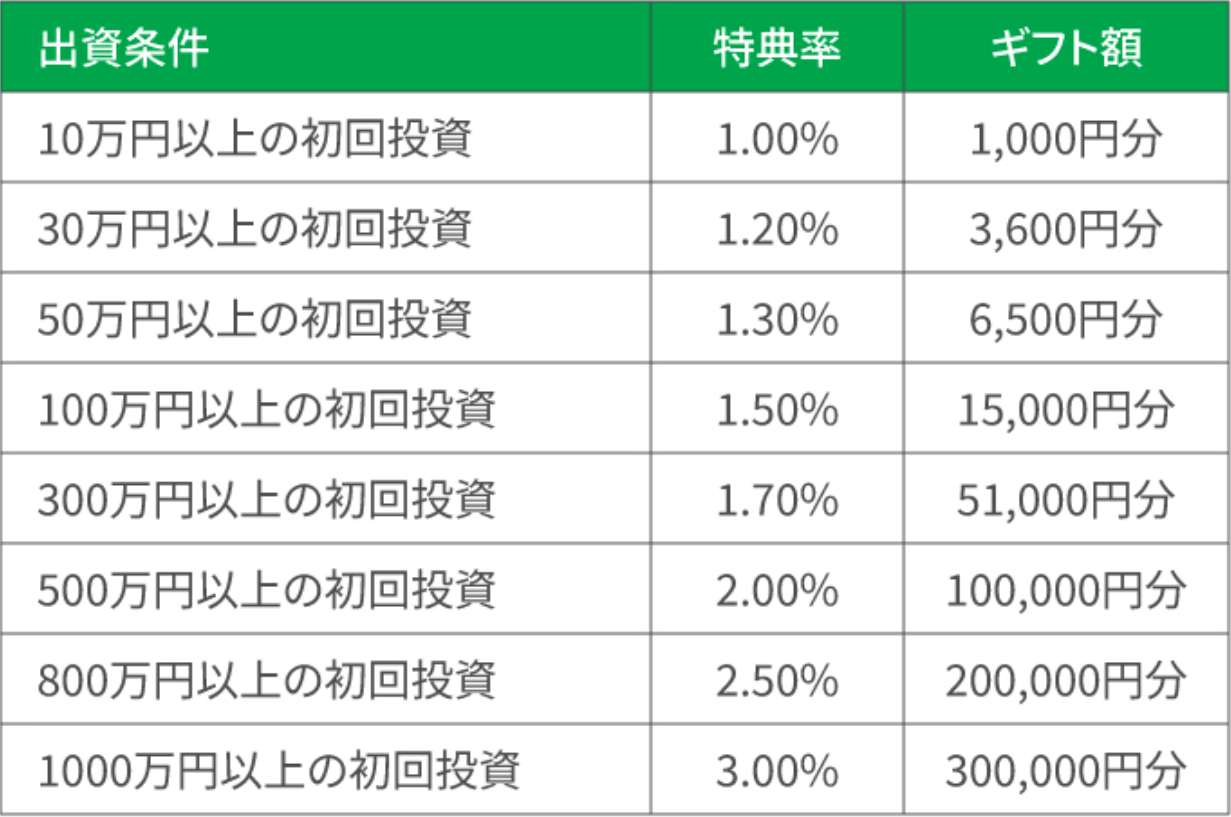 • さらに、投資家登録から30日以内の初回投資額に応じてAmazonギフトカード最大30万円分プレゼント