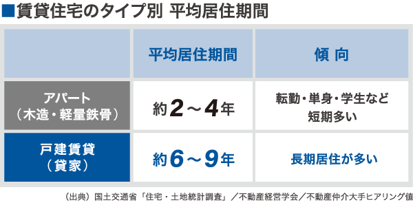 騒音ストレスの少なさに加え、専用駐車場や庭付きといった持ち家のような魅力があるため、入居が決まりやすく、平均6~9年と長期入居につながりやすいという特徴があります。
