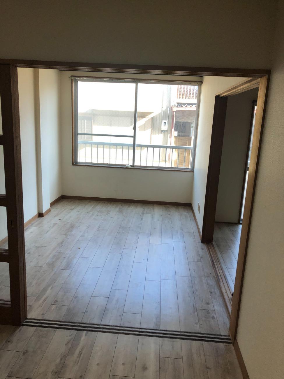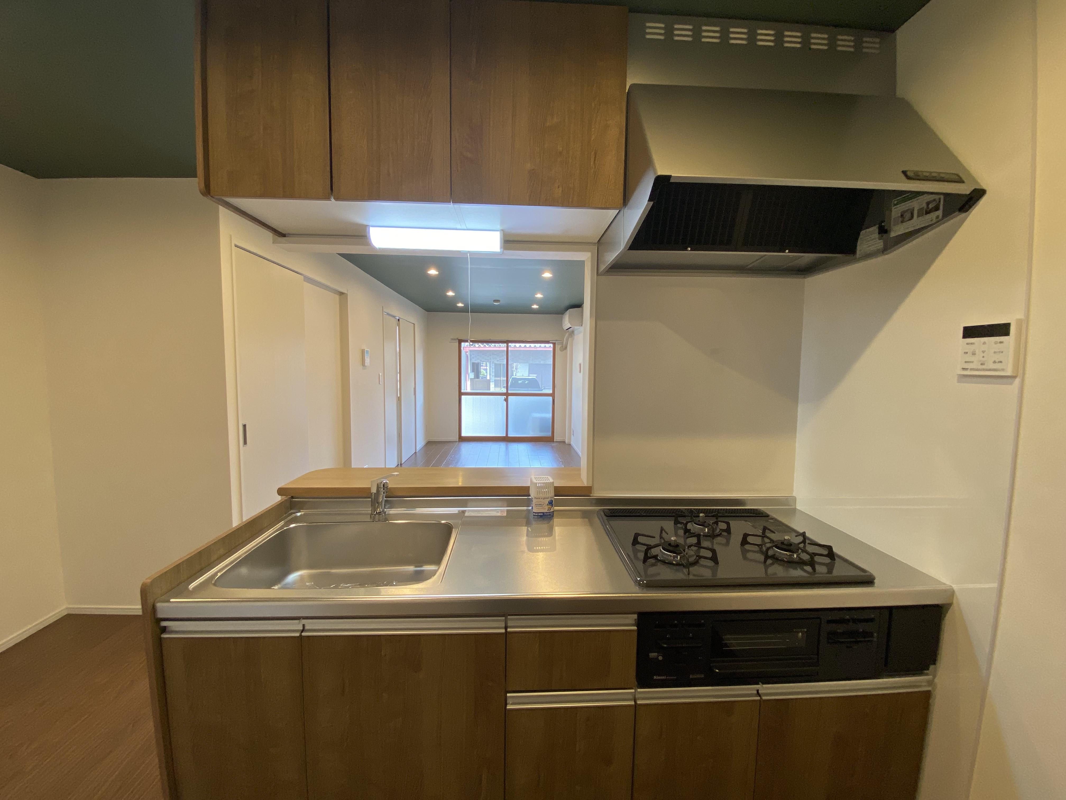 間取り変更し、1LDK・1Kでも募集出来る様に、建具で仕切りを作り、部屋の狭さを改善しました。新婚・単身でも楽しめる部屋を作りました。木目のフロアタイルをしっかりと受け止めるカーキ色の配色。木と緑を贅沢に使ったのぬくもりに囲まれるお部屋に生まれ変わりました。