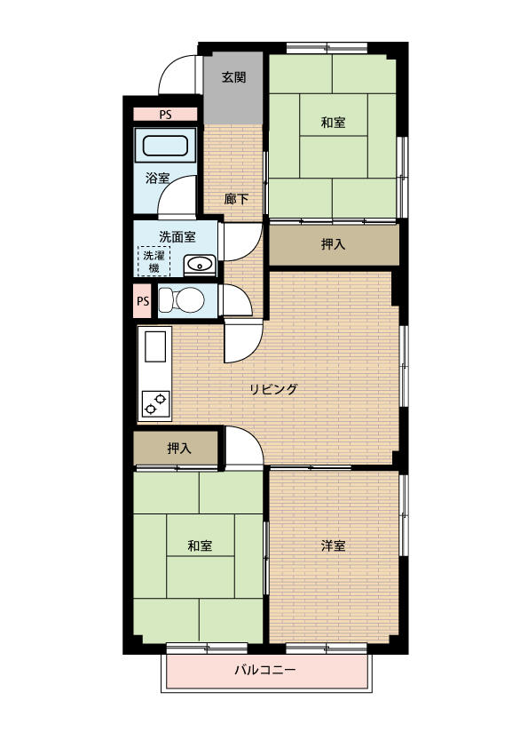 古いタイプの、ダイニングキッチンが中央にある3DKの間取りです。 各部屋までの導線とキッチン周りの導線でせっかくのダイニングキッチンをうまく使いづらくなっております。 また、ダイニングキッチンに窓がない為、全体的に暗い印象になってしまいます。